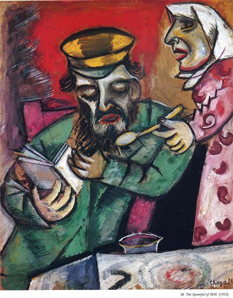 “A fundamental tenet of Judaism is the forcing of food onto someone who could probably do without it. Chagall employs milk in this painting, but it could just as well be some lox or a nice blintz.”