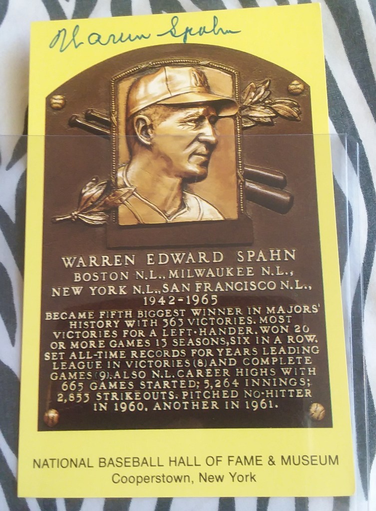 Spahn holds the MLB record for most wins by a lefty with 363. He won 20 games or more 13 times and won the Cy Young Award in 1957. He was an All Star 17 times and pitched two no-hitters. Get this — he had 2,583 strikeouts, but for several decades his HOF plaque said he had 2,853. In fact, the autographed postcard plaque from my collection, below, has the wrong amount.