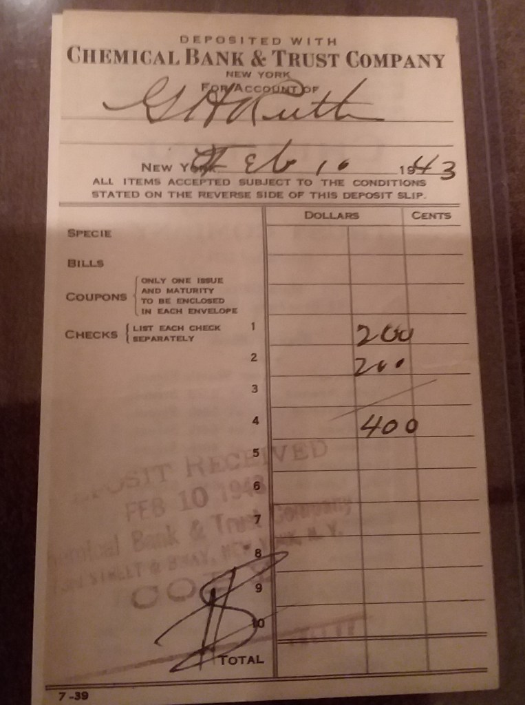 I bought the item pictured below from another collector for $25 when I was in high school. It’s a deposit slip signed by Ruth. Good move.
