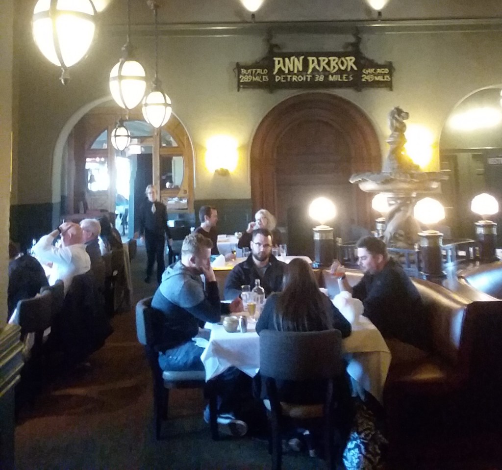Our lunch at the Gandy Dancer in Annie Arbor did not disappoint. Sam and Sarah ordered different treatments of salmon, Linda went with the scallops, and I had the snapper — all excellent. The calamari appetizer was even better. Here are some shots. Can you find Sam and Linda dining?