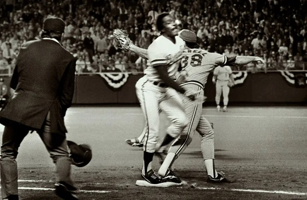 KC’s Jorge Orta hit a slow grounder to Jack Clark at first who tossed to the pitcher Todd Worrell covering. Orta was out by a step but Don Denkinger, umping at first base, called him safe. The TV replays confirmed that Orta was out, but this was before replays could be used to reverse calls. So Orta was safe. KC rallied and went on to win the game 2-1. The next day they trounced STL 11-0 in Game 7 for the Series win.