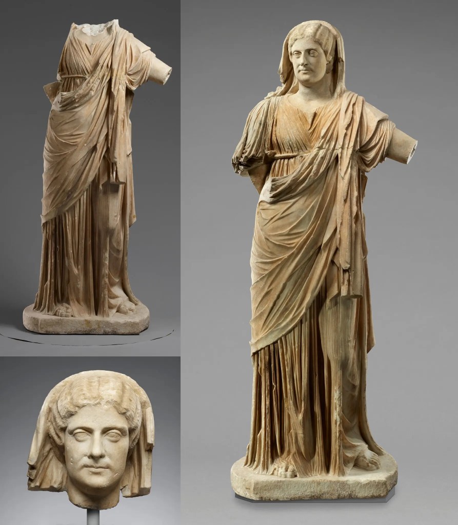 The rare occasion on which a head and a torso find their way back to each other is cause for great celebration. “Statue of a Draped Woman,” a 2,000-year-old torso, had spent almost 50 years at the Getty Museum in LA before a curator came across its head, a carved marble portrait of a stern-looking Roman woman in a NY gallery. That’s how the NYT described her — I don’t think she’s that stern-looking. That’s one thick-ass neck though.