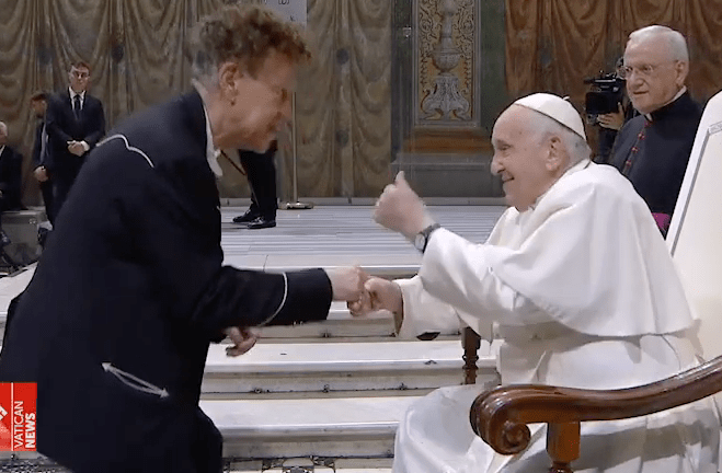 Among the invitees was the American Andres Serrano whose photo “Piss Christ” is an image of a plastic crucifix submerged in a tank full of urine. It was considered blasphemous when it debuted in 1987. Yet on Friday, as reported by the Times, “Francis blessed Mr. Serrano and gave him a cheery thumbs up.” Serrano was delighted and said he was sure the Pope knew exactly who he was. “It was a great, mischievous smile,” he said.