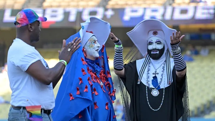 In a brief ceremony held on the field, the Dodgers gave a Community Hero Award to the Sisters. The public-address announcer said the group supports meal programs in the LA area and cited “their outstanding service to the LBGTQ+ community.”