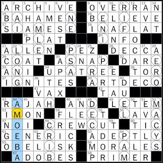 Remember 15A: The BAHA MEN? I didn’t. Their big hit was “Who Let the Dogs Out?” That was back in 2000. I’d have guessed it was longer ago. While the question makes sense in the appropriate context (assigning blame for whoever let the dogs out when they were supposed to stay in), the meaning of the lyrics eludes me. E.g.,