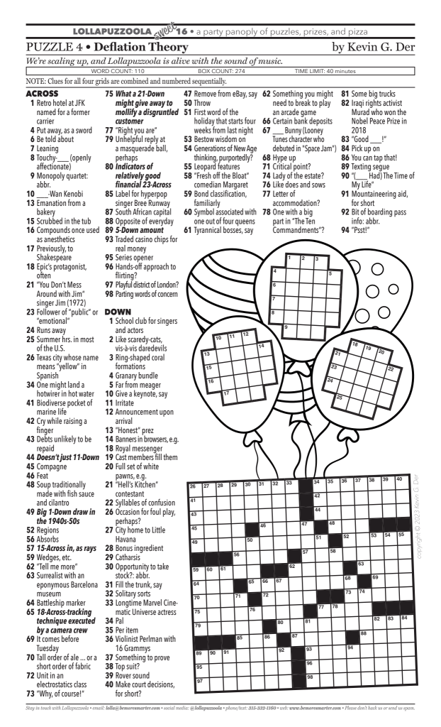Take a look at Puzzle 4 from the tournament yesterday, below: I want to point out some brilliant features of it. It was the hardest of the five puzzles. First, in each of those separate balloons, the letters HE had to be squeezed into a single square twice. That made them “helium” balloons. E.g., 6 across “Be told about” is HEAR OF, but the letters HE share a square so the answer can fit into five squares.