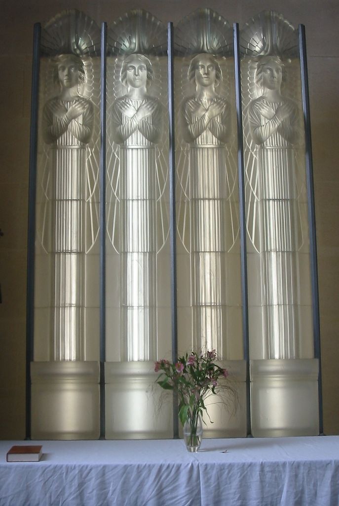 He started off in jewelry design but became better known for his work in glass. He was responsible for the walls of lighted glass and elegant colored glass columns which filled the dining room and “grand salon” of the SS Normandie, and the interior fittings, cross, screens, reredos and font of St. Matthew’s Church at Millbrook in Jersey (Lalique’s “Glass Church”). [That’s Jersey in the Channel Islands, not NJ, USA.] Here’s the glass altarpiece: