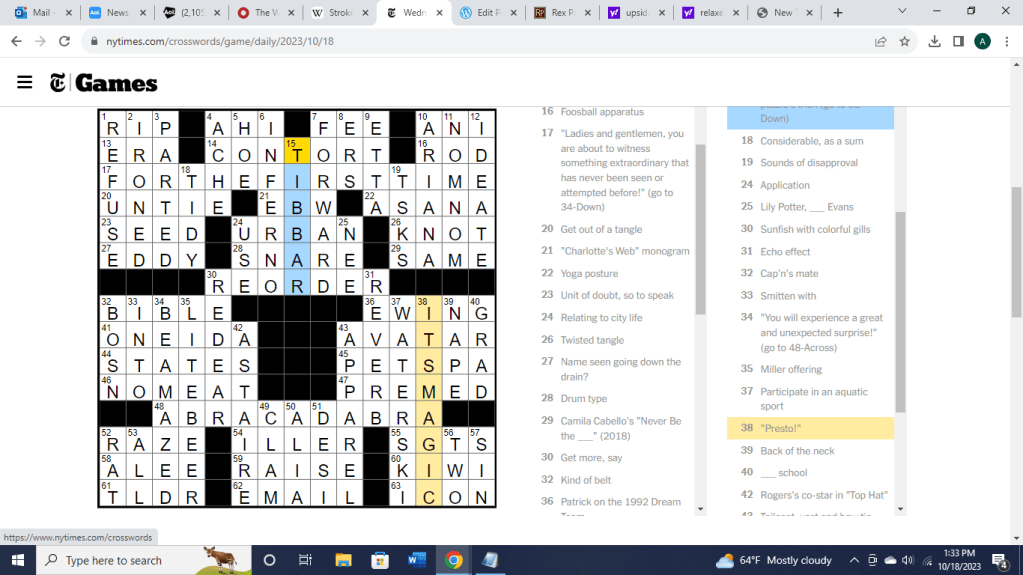 Today’s theme was magic, in particular pulling a rabbit out of a hat. You can see the hat in the center of the grid and the word TIBBAR emerging from it. That’s RABBIT backwards to show that it’s being pulled out of the hat.