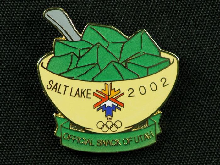 The best by far is the Jell-O Belt: a region containing a large Mormon population, which includes Utah, of course. Mormons love Jell-O. Who knew? One of the official pins for the 2002 Winter Olympics in Salt Lake City was a green Jell-O jiggler in the shape of the state.