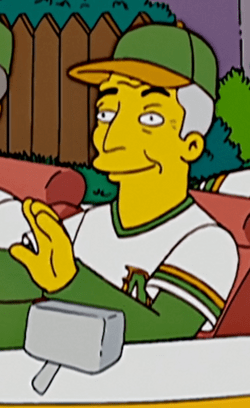 SAL BANDO was in the puzzle too — “Captain of MLB’s Swingin’ A’s of the 1970s.” Those A’s won three consecutive World Series (’72 – ’74), and he was a frequent All-Star and near-MVP. Take a look at that wonderful Italian punim — first his real one and then how he appeared in his cameo role on The Simpsons! He passed away earlier this year at 78. Rest in peace, Salvatore.