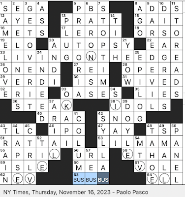 Today’s puzzle by the brilliant Paolo Pasco is one for the ages. Quite a “feat” of construction. The theme is Evel Knievel, the insane stunt guy who, miraculously, died of natural causes back in 2007 at age 69. The puzzle spells out his name in circles that rise up a ramp, soar over a group of buses, and land safely on the other side. The letter/circles are part of crossing answers, and the buses are the ends of the answers COLUMBUS, REBUS, and SYLLABUS. (See the bottom section of the completed grid below.) Also, 23A is LIVING ON THE EDGE, and 9D is DAREDEVIL. Last, the clue at 3D is “Punny advice for this puzzle’s subject,” and the answer is GET OVER IT. Whew — exhausting — the man knows how to construct a puzzle. Even Rex was impressed. Oh, I almost forgot to mention (!), if you complete the puzzle online, the software actually shows a little motorcycle in motion — riding up the ramp, soaring, and coming down the ramp. (I’m not kidding.)