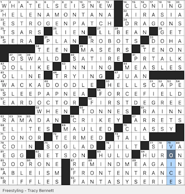 Yesterday, 66D was “Carmina Burana composer,” who is, of course, CARL ORFF. Here’s a good way to use it in a sentence: “Once it was clear that the bank robbers had left New Jersey, the Jersey state troopers decided to Carl Orff the search.”