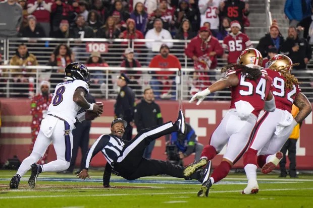 In Baltimore’s solid win over SF last night, there was a weird play that led to the score being 2-0 SF — odd for a football score. Baltimore’s QB, former league MVP Lamar Jackson, was pedaling backward for his life, fleeing SF pursuers (or perusers, right George?). The ref was back-pedaling alongside him, because that’s what they do, to stay near the action. But the ref fell on his ass, just as Jackson turned in his direction. Jackson fell too and since this took place in the end zone, if he were tackled it would be a safety for SF and two points. So Jackson threw the ball away: a harmless incomplete pass. The problem was there was no receiver nearby, so Jackson was called for intentional grounding and SF got their two points anyway. I didn’t think they should have called it because the ref’s falling played a role in the play. But it’s the right call — the ref is treated as part of the field, and what happens happens.