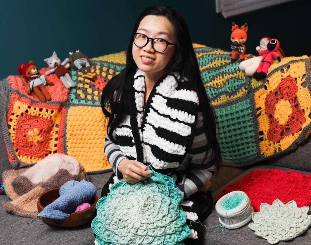 His wife’s cute. SuXiao Yang. She’s a professional photographer, so she and Phil had a lot to talk about, although Phil kept keeling over. She is also a violist and has developed a passion for knitting and crocheting, as this photo illustrates.