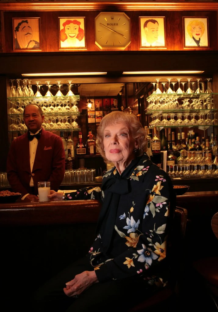 Here’s a shot of her at age 83 — still looking damn good — in Sardi’s, below caricatures of Ralph, Alice, Ed, and Trixie above the bar.