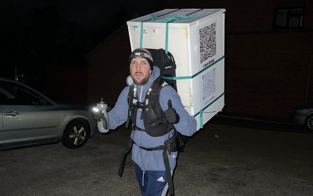 His name is Daniel Fairbrother and he’s 34. He’s running to raise 10,000 British pounds to fight diabetes because a friend of his came down with the disease. He didn’t think running normally would be much of a draw for fundraising. So when he heard about a marine who ran a marathon with a refrigerator strapped to his back, he thought, Aha — that’s the ticket!, or something like that. Once the police were informed of the reason the refrigerator was strapped to Fairbrother’s back, they shook his hand and wished him good luck. One of the officers said jokingly: “You do know if you order from Currys, they will deliver it for you?”