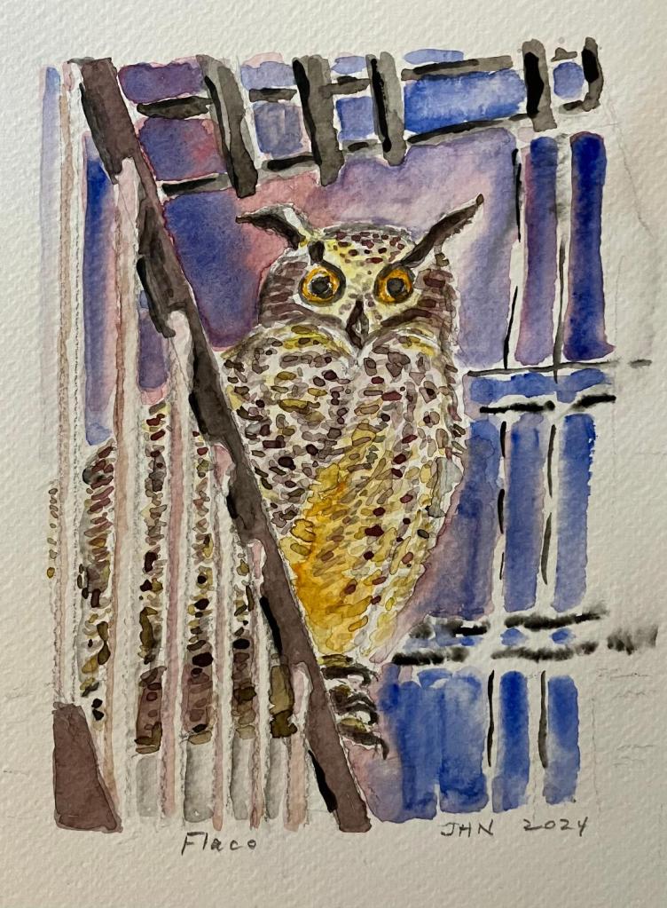 This gorgeous portrait of the NYC owl Flaco was shared with me by the artist Massachusetts Jenny. It appears here in OC without her permission — I was afraid to ask in case she said no.