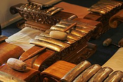 Other notable instruments include xylophones, bamboo flutes, a bowed string instrument called a rebab, below, and a zither-like instrument called a siter.