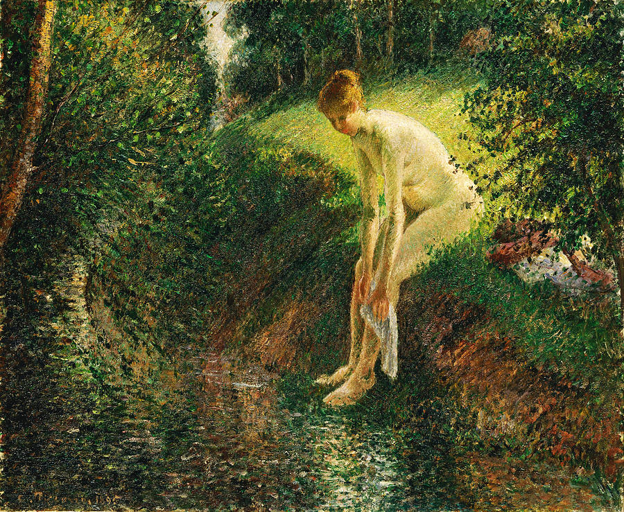 “Bather in the Woods” painter was Camille PISSARRO. I hesitated because I didn’t recognize the spelling — double S and double R. Okay, if you say so.