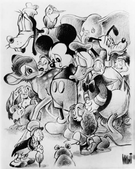 Wright often said the cartoon of his that generated the strongest response was a sentimental one that depicted Mickey Mouse and other Disney characters in tears when Walt Disney died. Disney’s widow Lillian requested Wright’s original drawing of it, and when she died she bequeathed it to the Library of Congress. [My cousin Aaron works there, BTW — he’s the Head Shusher.]