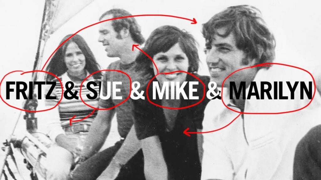 Now, as for that trade. It wasn’t between two teams. Here’s the story. Peterson and Mike Kekich were close friends, and their families were close too. In the summer of 1972 it became clear that Peterson and Mike’s wife Suzanne had fallen in love, as had Mike and Peterson’s wife Marilyn. So they traded families — wives, homes, kids, the whole nine yards. Peterson and Kekich simply traded places in each other’s home. This photo may help you keep score.