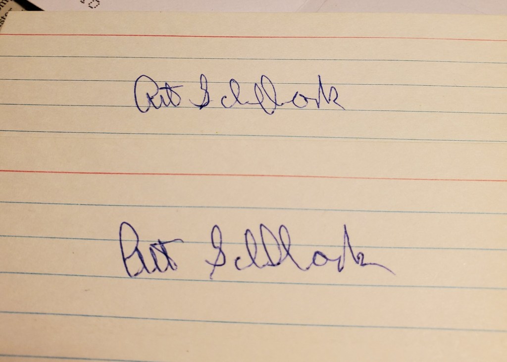Hey, remember a short piece we wrote on Art Schallock, who pitched for the Yanks in the early 50s and just turned 100? He responded to my polite request for his autograph with two signed index cards. A little shakily, but not bad for 100. Thanks Art!