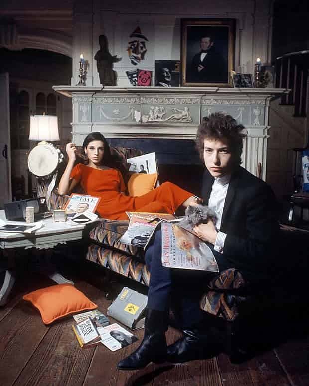 It was taken by one of Phil’s heroes, Daniel Kramer, who died late last month at the age of 91. It was shot in the living room of the home of Dylan’s manager, Albert Grossman, near Woodstock, NY. The woman in red is Sally Grossman, Albert’s wife. That’s a cat on Dylan’s lap, and Kramer explained that he took only ten shots that day and the one you see was chosen because it’s the only one with the cat looking at the lens. It earned Kramer a Grammy nomination. He also shot the cover of “Highway 61 Revisited.”