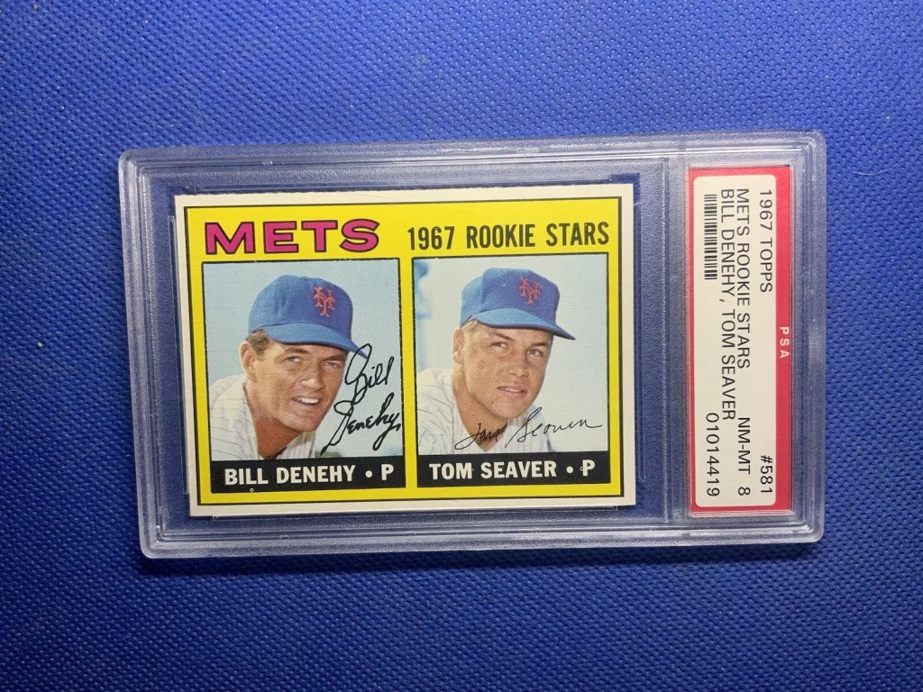 As you can see, Seaver is paired with another pitcher, Bill Denehy, on the card. Denehy’s lifetime record in the majors was 1-10, with an ERA of 4.56. Any claim he can make to fame would revolve around his being traded by the Mets for manager Gil Hodges, in November of 1967. Hodges of course managed the Mets to the world championship in 1969 and is in the Hall of Fame. Denehy is still living and is 78. Sadly, he started losing his eyesight in 2005 and became totally blind in 2018.