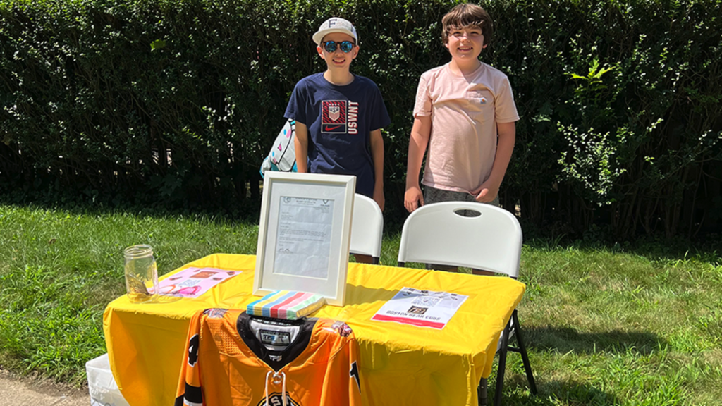 When Danny complained that he was bored over the summer, his mom Nancy suggested he open an ice cream stand on their lawn and donate half of the money they make to the team. His family made their own ice cream at home and Danny came up with a few flavors, designed a logo, and set up his table. That’s Danny on the right, below. They call the stand “Tree Street Treats.”