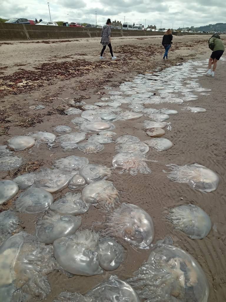 Thomas McChristie shared: Happens around the same time every year… Jelly fish in the waters in the summer are a good thing, they eat plankton and help purify our waters. Between September and October they die off and you’ll find them washed up on our shores. They’re known as barrel jellyfish or to local fishermen as the blob.