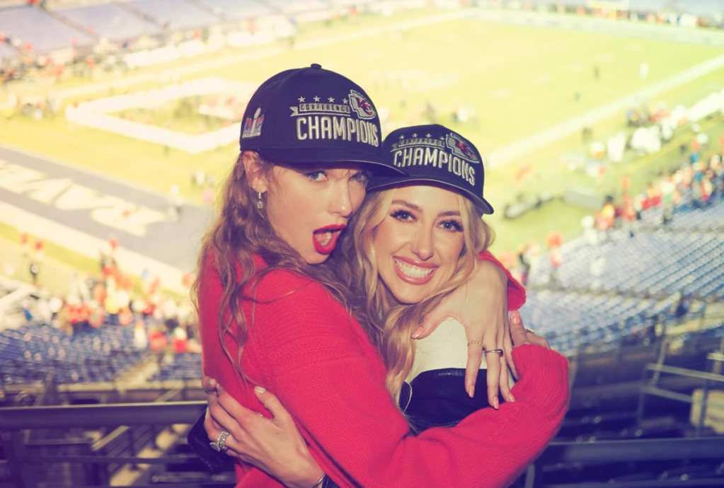 In the ongoing saga of Taylor and Travis, there was concern last week of a rift between Taylor and Brittany Mahomes, the wife of Travis’s buddy, QB Patrick Mahomes. Brit had come out supporting Trump, and Taylor, of course, is with Kamala. But the latest word is B may be souring on Trump. She was quite miffed at his attack on Taylor. Here they are, a while ago, mugging for our Phil.