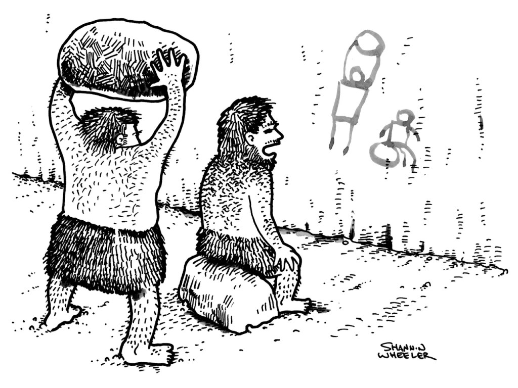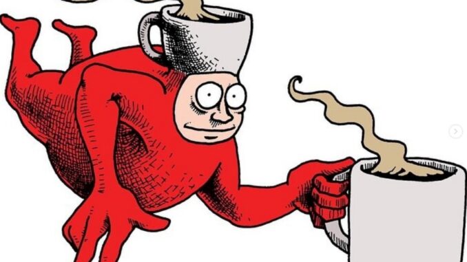 That one is by Shannon Wheeler who grew up in Berkeley CA. He’s best known for the character Too Much Coffee Man, who rarely sleeps and derives his powers from coffee and cigarettes. He’s been in outer space and a U.S. prison.