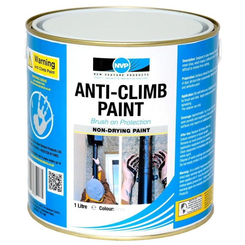 Anti-climb paint is thick and oily in consistency, similar to petroleum jelly, designed to make walls, fences and other surfaces slippery and hard to climb. The anti climb paint will form a thin skin helping to prevent leaves and the like from sticking to it but because it is thixotropic any pressure applied to it will make it return to liquid making it difficult for an intruder to gain a hand or foot hold.