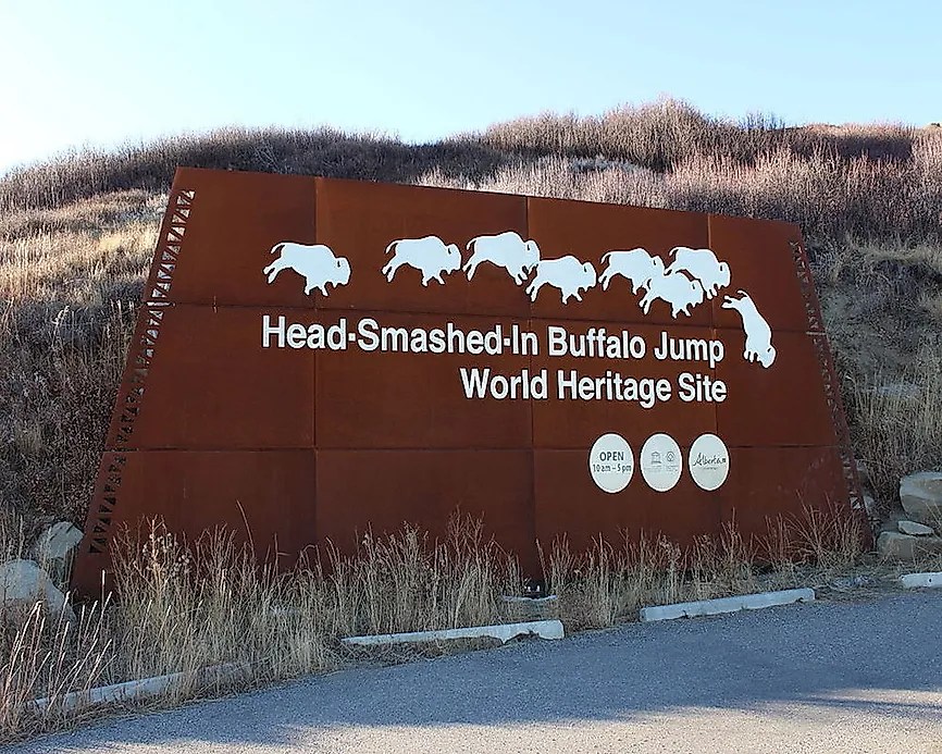 The buffalo jump was used for 5,500 years by the indigenous peoples of the plains to kill bison by driving them off the 36 foot high cliff. The Blackfoot drove the bison from a grazing area to the “drive lanes,” lined by hundreds of cairns, by dressing up as coyotes and wolves. These specialized “buffalo runners” were young men trained in animal behavior to guide the bison into the drive lanes. Then, at full gallop, the bison would fall from the weight of the herd pressing behind them, breaking their legs and rendering them immobile. The site was in use at least 6,000 years ago, and the bone deposits are 39 feet deep. After falling off the cliff, the injured bison were finished off by other Blackfoot warriors at the cliff base armed with spears and clubs. The carcasses were then processed at a nearby camp. The bison carcass was used for a variety of purposes, from tools made from the bone, to the hide used to make dwellings and clothing. The importance of the site goes beyond just providing food and supplies. After a successful hunt, the wealth of food allowed the people to enjoy leisure time and pursue artistic and spiritual interests. This increased the cultural complexity of the society.