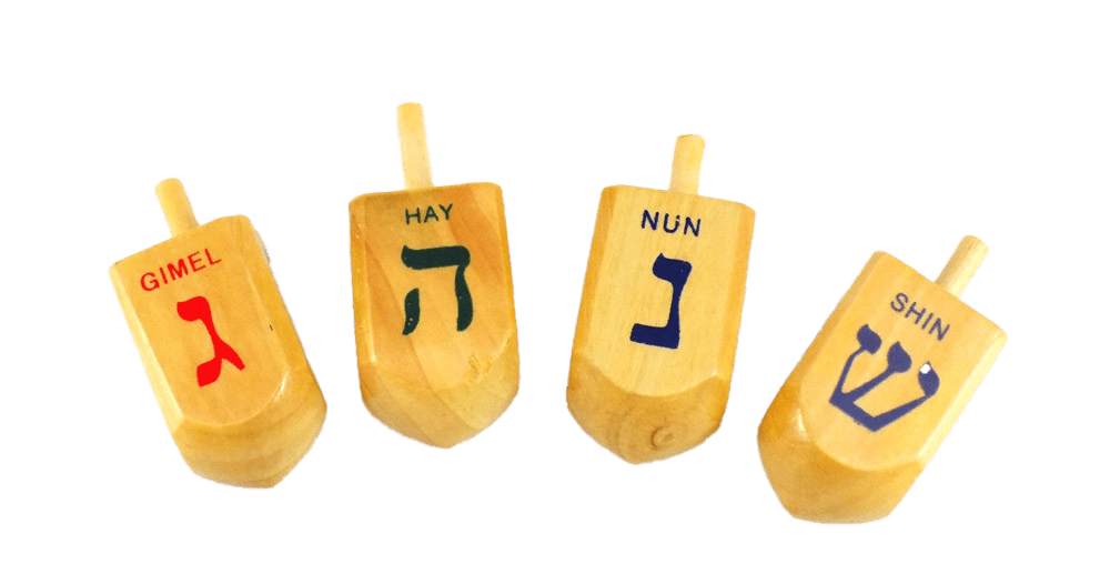 If you’re wondering how dreidel is played, each side of the dreidel bears a letter of the Hebrew alphabet: נ (nun), ג (gimel), ה (hei), ש (shin).