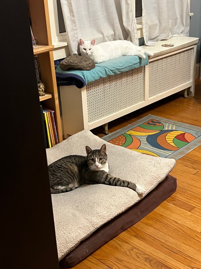 And here are Rex’s beloved cats, Ida (white) and Alfie.