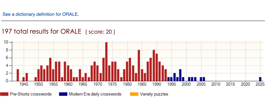 Extremely easy puzzle—hardly hesitated while filling it all in—except for one answer: a textbook piece of crosswordese risen from the dead to haunt and ultimately destroy this puzzle. There may as well not be any other words in this puzzle. It’s so weird and alien and from-outerspace that it’s hard to pay attention to anything else. I’m talking of course about ORALE. This is the kind of word that crosswords of yore used to rely on a lot because, I mean, look at those letters! Choice, common letters. Think about how often you see ORATE or ORALB or even ORANG in the puzzle, Wouldn’t it be nice to have somewhere else to go when facing ORA–? Well, yes it would. So, because everyone was filling grids by hand with no computer assistance, constructors used to cling to just about Anything that counted as a “word.” And so ORALEs filled the grid. Never a dominant word, but … look at this ORALE frequency chart. I mean, really look at it, because it is telling: