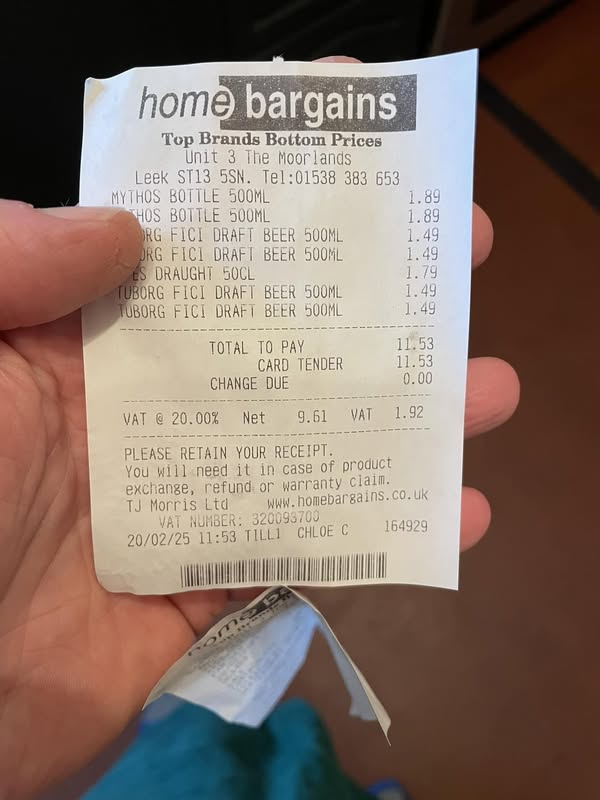 “I was being rude and looking at the phone at the till when the cashier said to me “11:53.” I said yes, thinking she was telling me the time. Turns out the time was the exact amount I’d spent on Turkish and Greek beer.