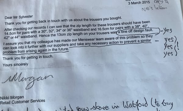 Emboldened by his victory, he then went back to the M&S store and discovered they were still selling the ‘faulty’ trousers. He wrote to M&S and demanded they take them off sale. They replied in June 2015 apologising and promising to look into it.