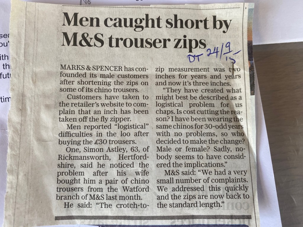 Just going through his stuff we’ve found this perfect example of dullness. The background is that he bought a pair of trousers from M&S, and discovered that the zip was shorter than he was used to – thus making the act of going for a wee a tiny bit more inconvenient.
