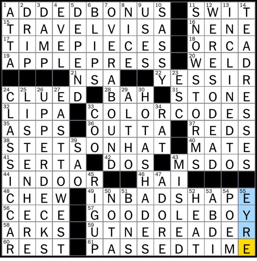 Another cute one was at 22A: “Private agreement?” (The cute ones tip their hand with a question mark at the end.) This answer was YES SIR. It’s a private in the army, of course.