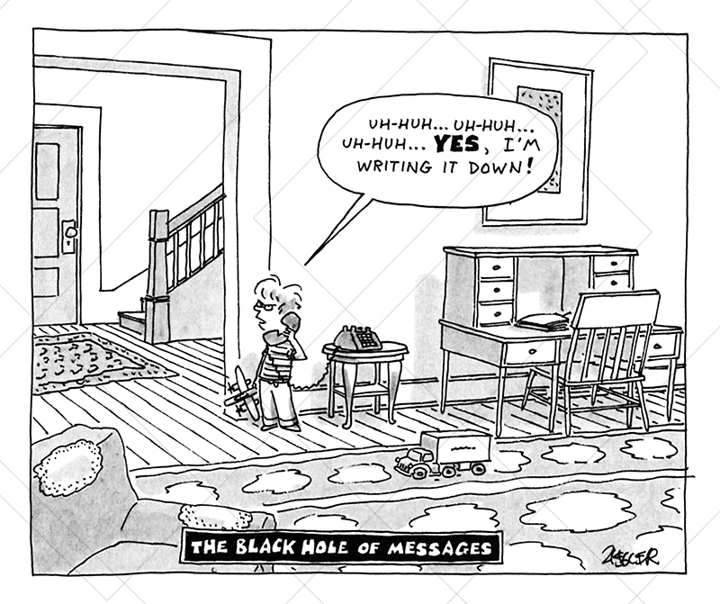 At 57A, “Unwritten reminder” was MENTAL NOTE. Commenter Nancy took credit for this quip: “A mental note isn’t worth the paper it’s written on.” It reminded me of a New Yorker cartoon by Ziegler I loved from years ago (when they were funny).