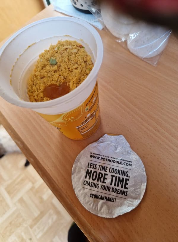 Greg Smith shared some good news. He posted the following photo with this note: “Yeah, I managed to get the lid off my pot noodle without tearing it.”