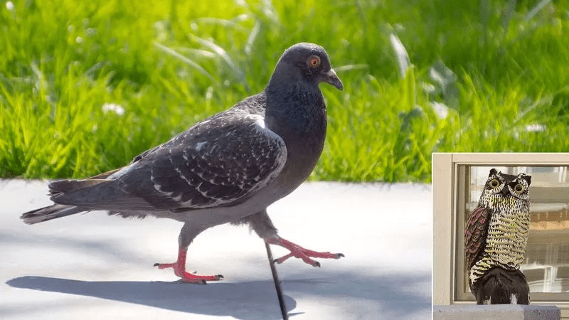 The 3-year-old pigeon, above, who months after his initial encounter with the artificial owl acknowledges he still gets “kind of freaked out” by it, reportedly doesn’t like walking or flying near the railing where the 16-inch-tall lawn ornament has been placed, despite knowing full well that it’s just a harmless piece of molded plastic and not a dangerous predator.