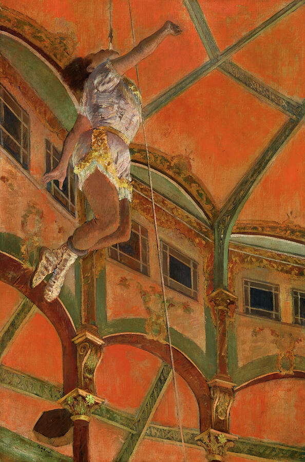 Miss La La was a mixed-race acrobat, known as la femme canon. The nickname came from her most sensational trick: to fire a cannon suspended on chains that she held in her teeth while hanging from the trapeze, hooked at the knees. (Yeah, that same old tired trick any five-year-old can perform blindfolded today.) In the painting, Degas has the viewer seeing the spectacle as the audience would have done, gazing up at the daring feat taking place above.