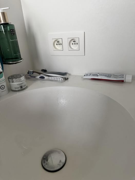 This is a picture of the bathroom in our Belgian hotel. I have never seen sockets so near to a tap before. Do the continentals not electrocute themselves?