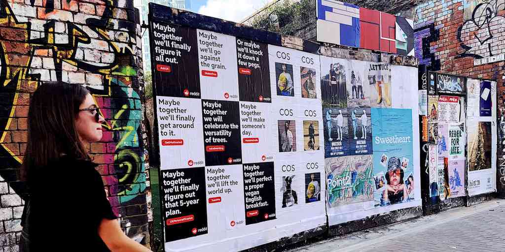 [FYI: Flyposting (also known as bill posting) is a guerrilla marketing tactic where advertising posters (also known as flyers) are put up. In the U.S., these posters are also referred to as wheatpaste posters because wheatpaste is often used to adhere the posters. Posters are adhered to construction site barricades, building façades and in alleyways.]