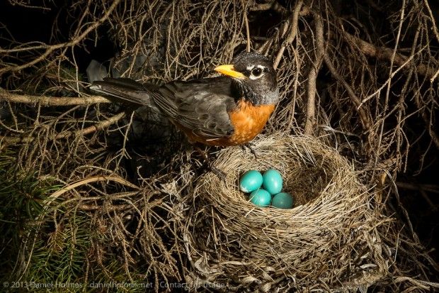 Mom-robin was the soul of patience as she sat incubating those eggs. Our neighbors are having their driveway, front walkway and back patio replaced, and she had to carry out her vigil through the sounds of jackhammers and stonecutting saws – what a cacophony! I found it interesting that although she mostly sat there quite motionless, she did feel free to fly off for brief forays, presumably to eat. (It was during one of these absences, of course, that the crow struck.)