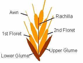 39A: “Botanical bristles.” I really bristled at that one. Had no idea the answer was AWNS. Apparently, it was a very popular word in crosswords pre-Will Shortz. Yup, here’s the dictionary on it: a stiff bristle, especially one of those growing from the ear or flower of barley, rye, and many grasses. Note, below, the distinction between an awn and the others: the rachilla, the first and second florets, and the upper and lower glumes.