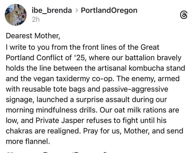 As you know, Portland Oregon has turned into a war zone requiring military intervention. Here’s a report from the front: